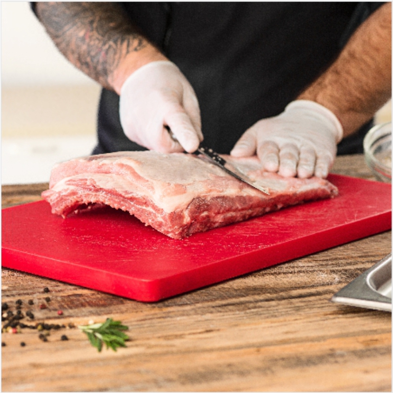 Sani-Cut Plastic Cutting Boards are manufactured from a lightweight, food grade High Molecular Weight Polyethylene (HMWPE). Specific colours for specific applications, thus avoiding cross contamination and adhering to HACCP protocols. (Widely used in the industrial and retail food processing operations.)